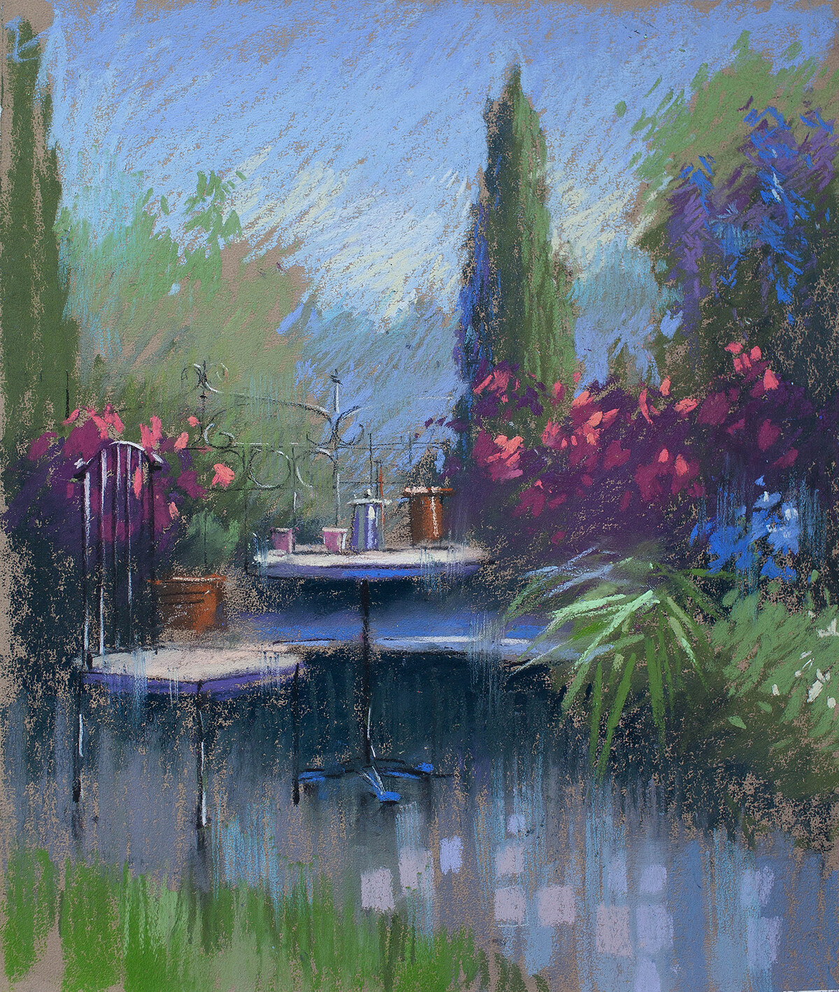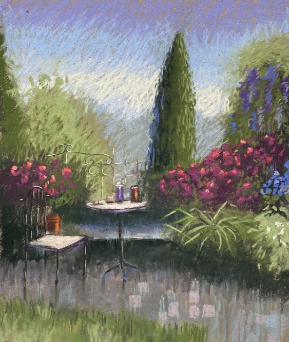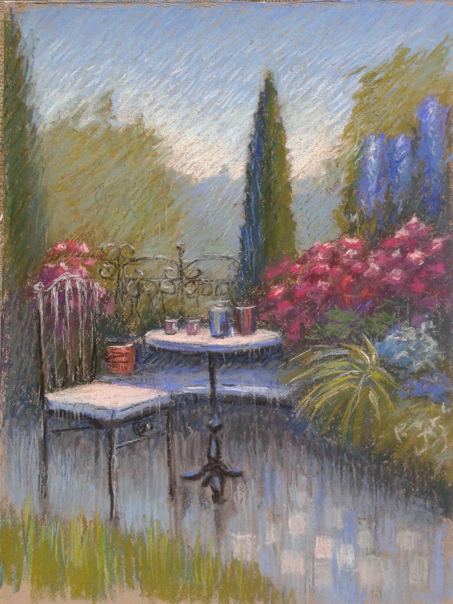 На дорожке мы используем элемент искаженной перспективы (плоско решаем брусчатку), в некоторых местах используем штрих для того, чтобы внести в работу некоторый элемент стилизации.
