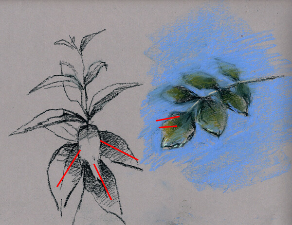 1. Нарисовать стебель с листьями, использую 1 цвет и тон зеленого пигмента. Отработать живую линию ( разный нажим, опорные точки, пластику). Передать воздушную перспективу, выделив листики, которые ближе к нам.