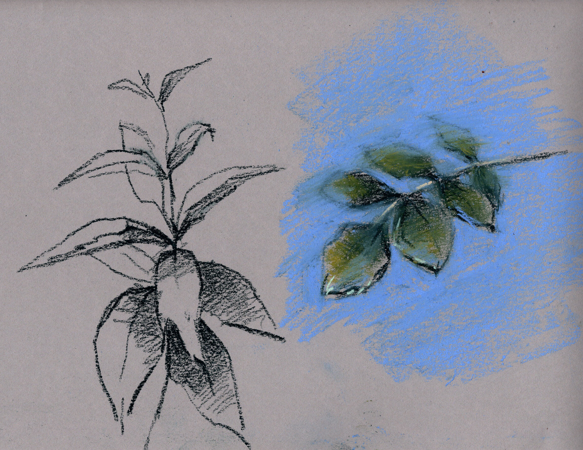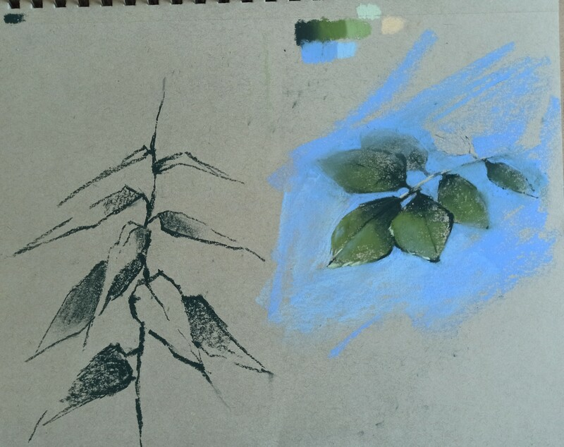 2. Нарисовать веточку с листьями в цвете. Использовать градацию зеленых, 3-4 тонов (тень холоднее и темнее, свет теплее и светлее). С помощью голубого пигмента фона увести листья, которые дальше от зрителя, в перспективу). Важно! - не обводить фоном объекты, они очень плавно входят, смешиваясь с голубым.