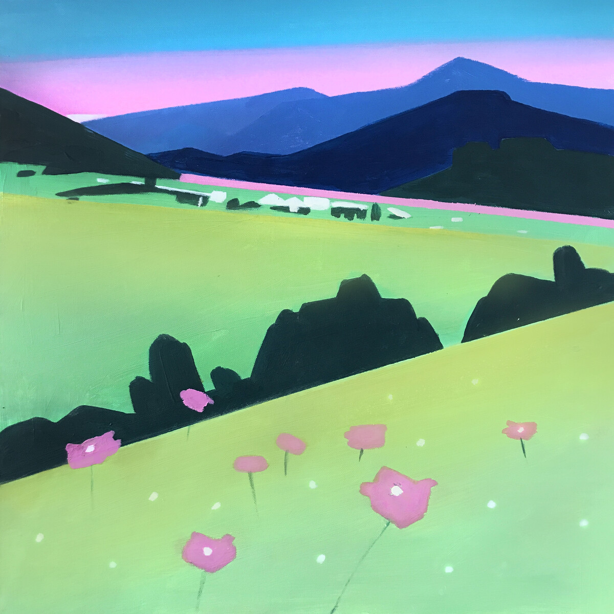 - Определяем, какие цвета наилучшим образом выразят задуманное чувство, подбираем оттенки и несколькими широкими движениями закладываем пятна. Формат работы маленький, 20×20 см.