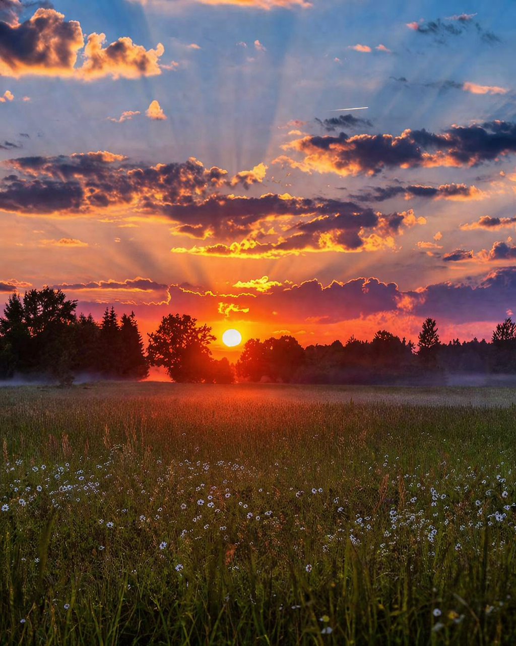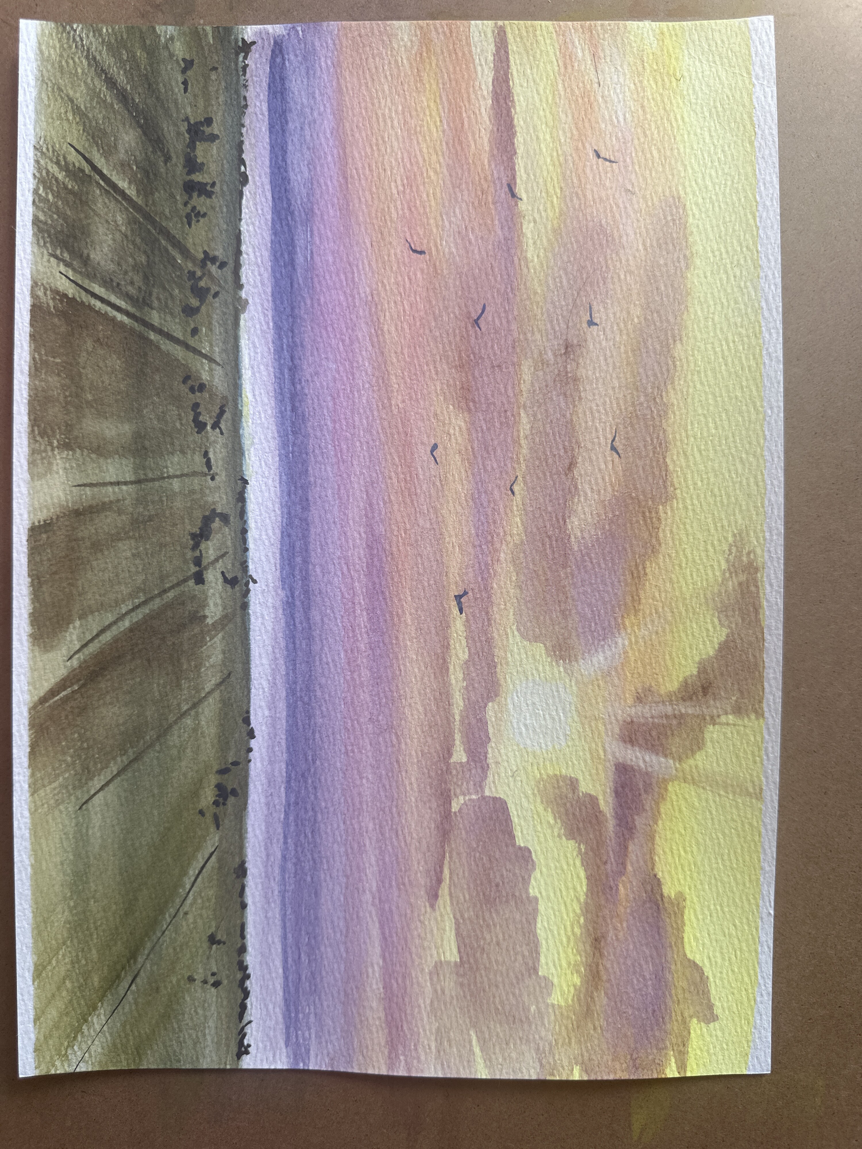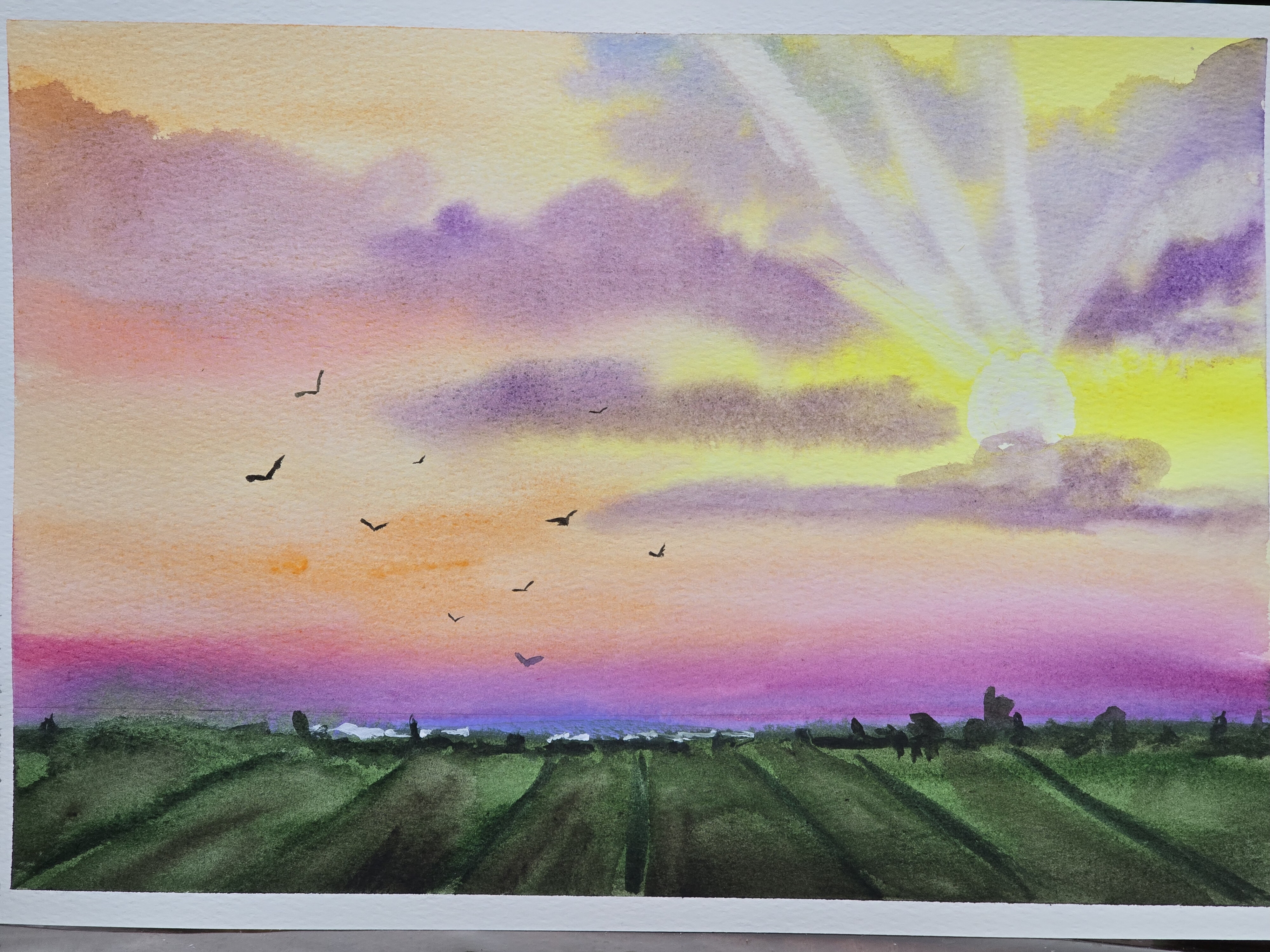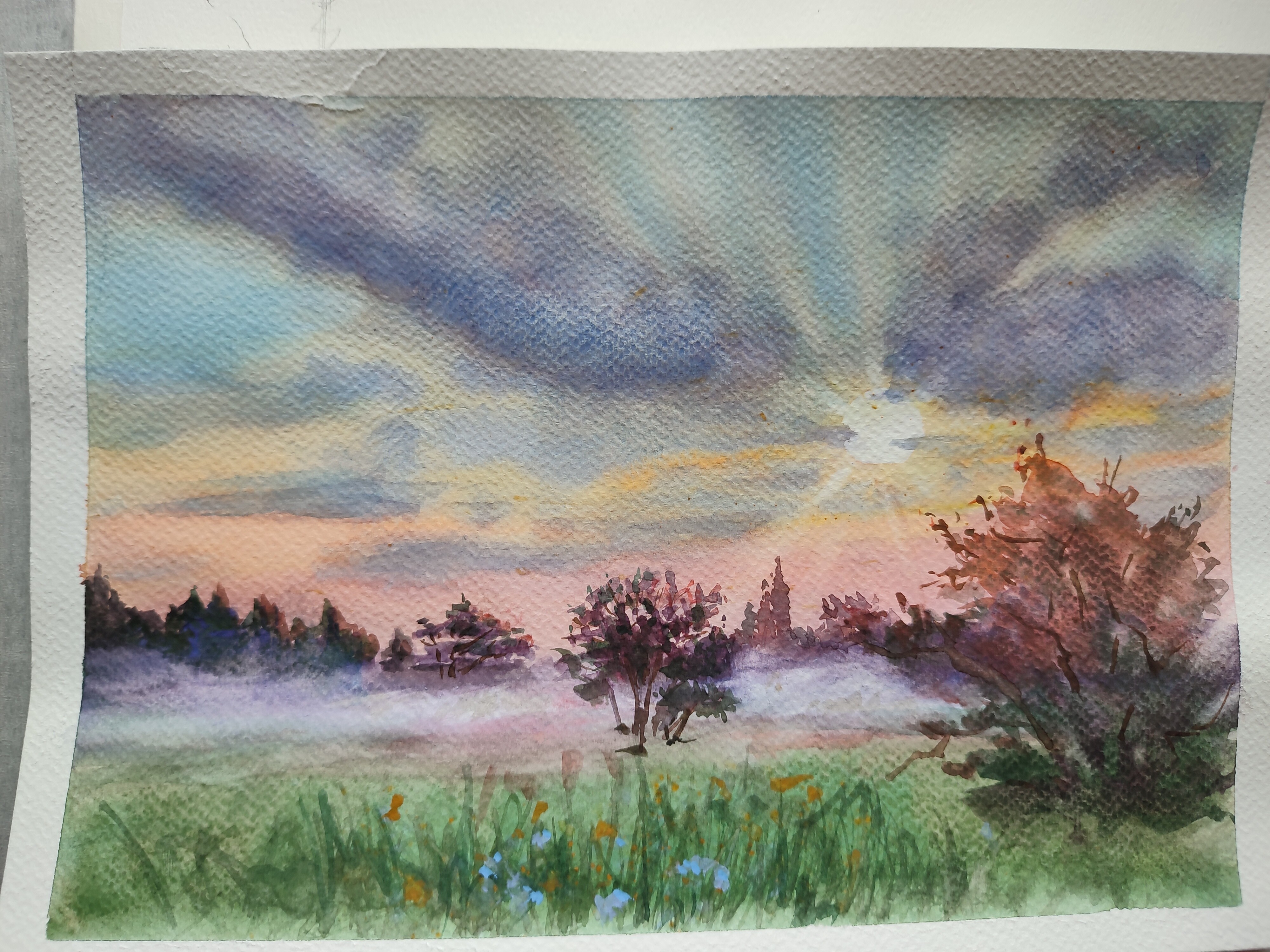 - нарисуем рассвет с лучами солнца в пастельных тонах;