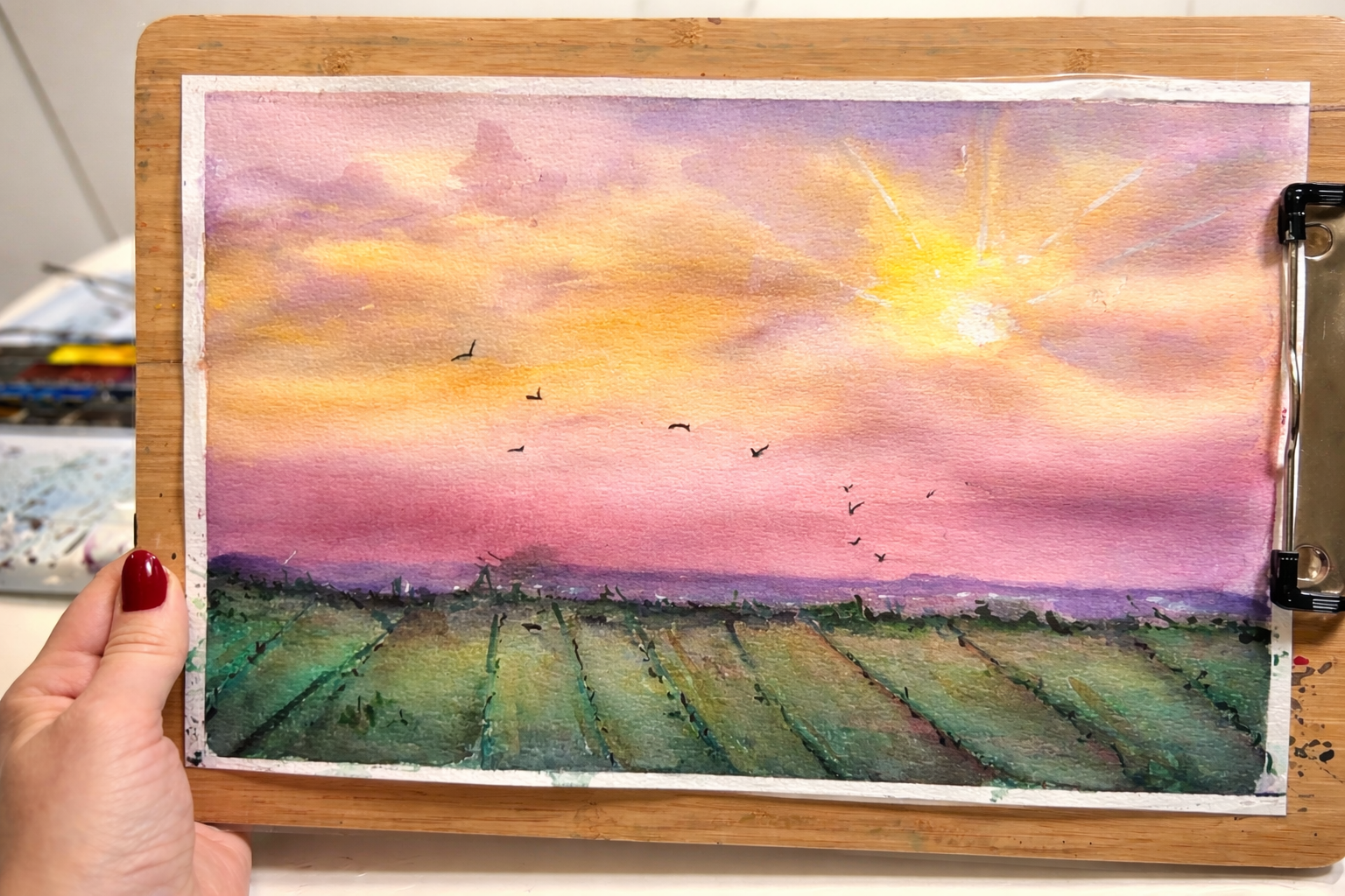 Приветствую вас на первом уроке марафона «Небесная палитра» с Александрой Подушкиной! Пять дней мы будем создавать акварельные пейзажи, наполненные светом, воздухом и внутренней тишиной.