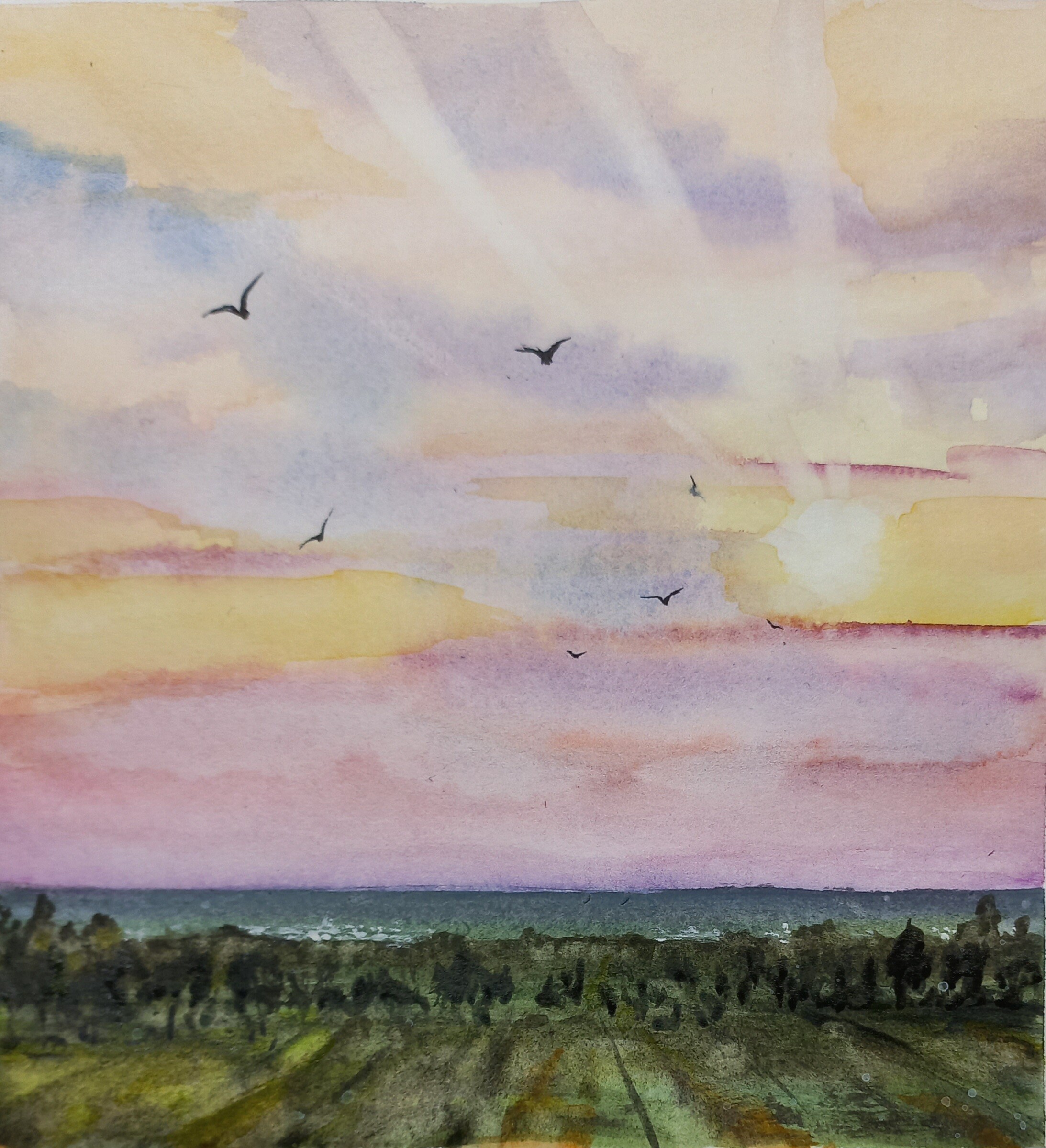 Там вас ждут 12 картин акварелью с разными состояниями неба: от рассветов до северного сияния.