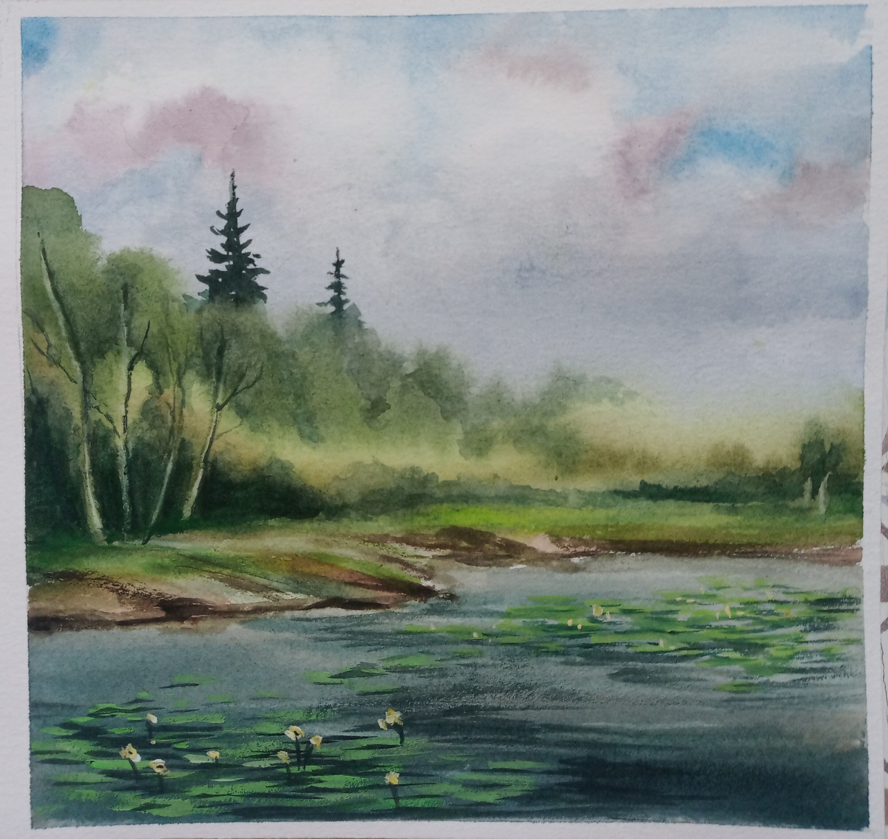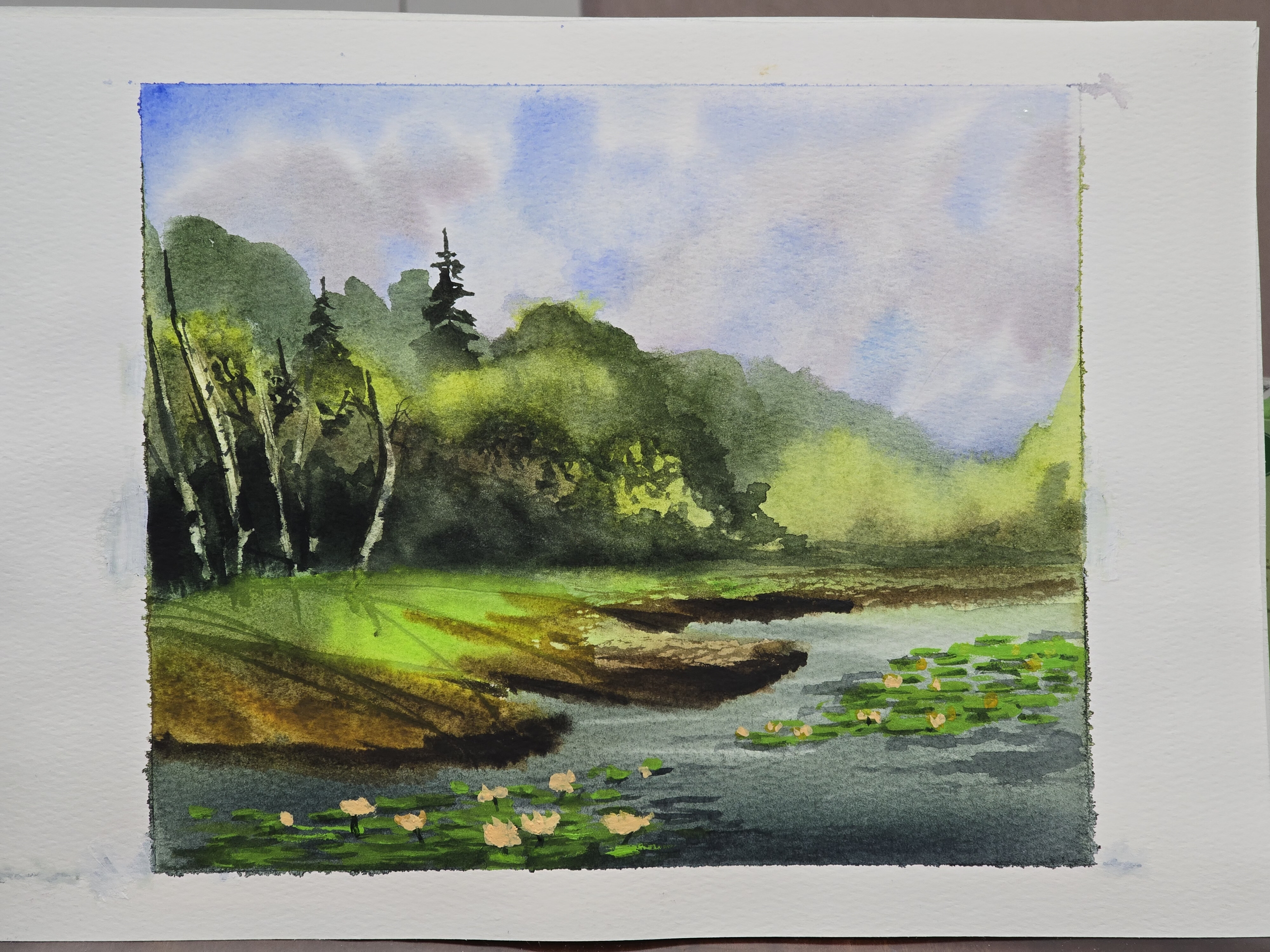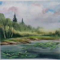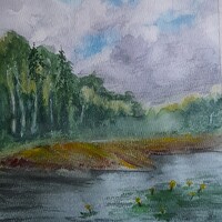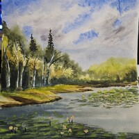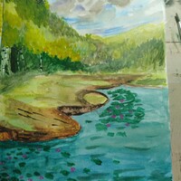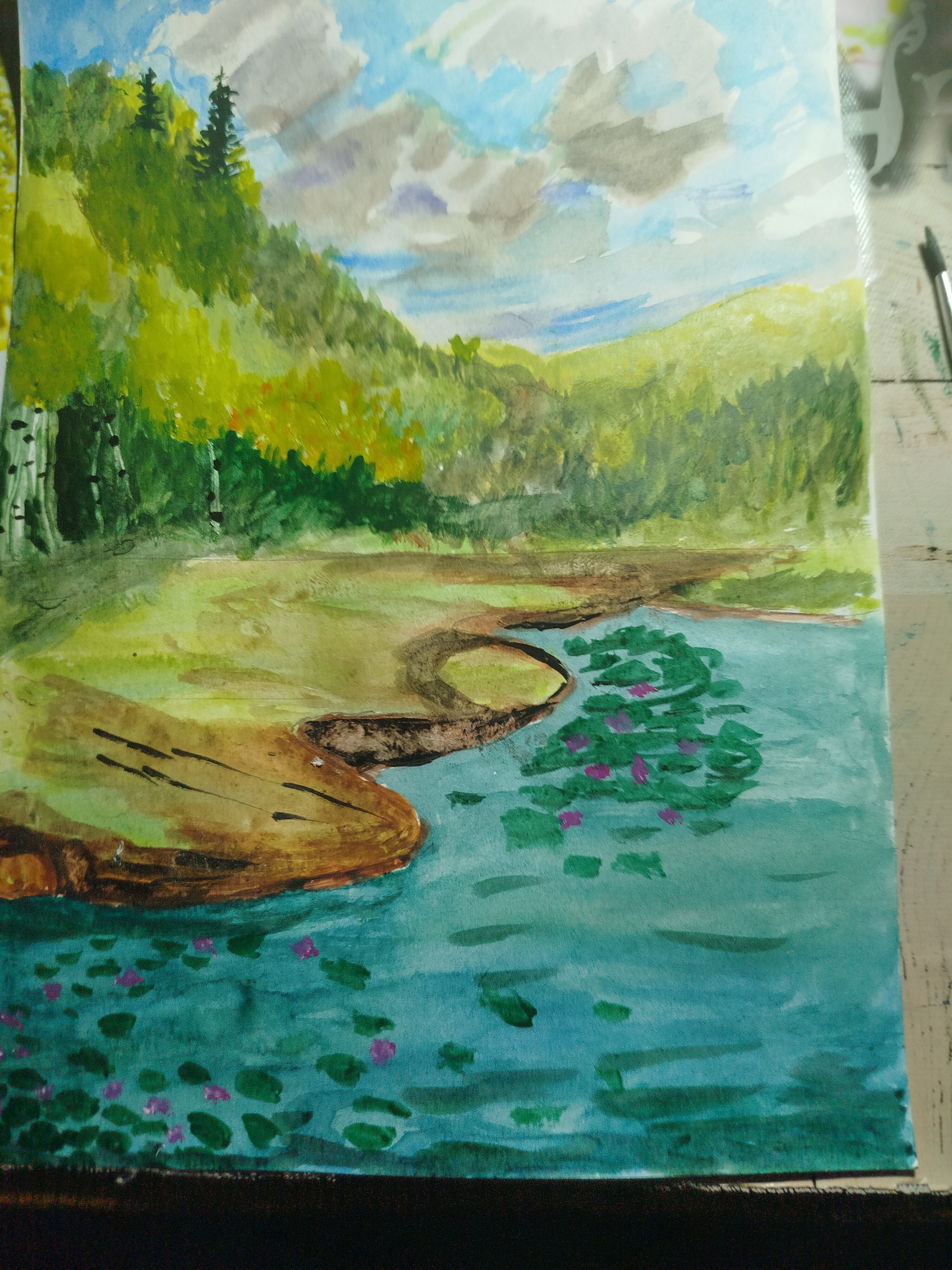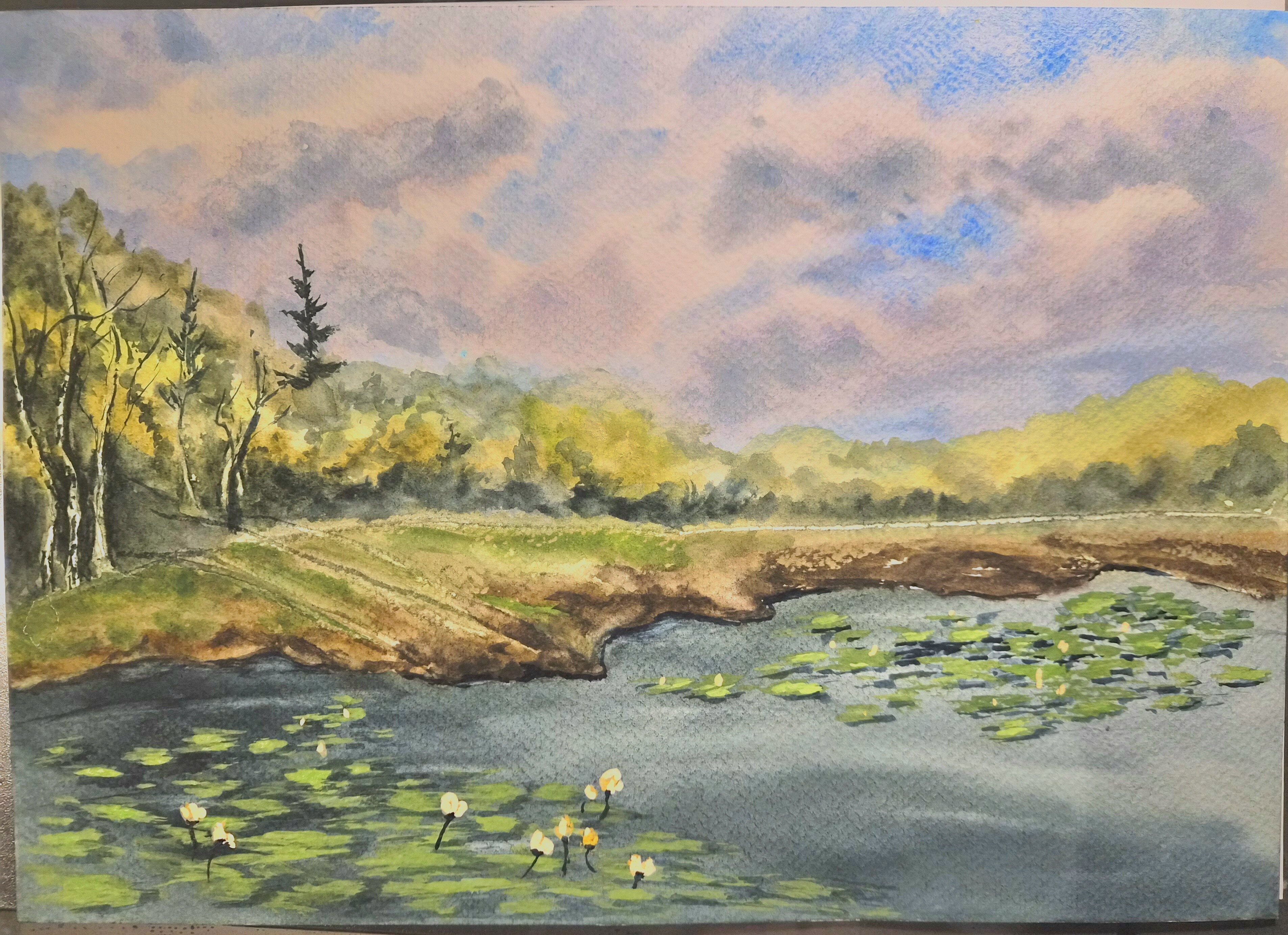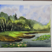 - поработаем с контрастами: яркая сочная зелень будет сочетаться с тёмной водой и небом;