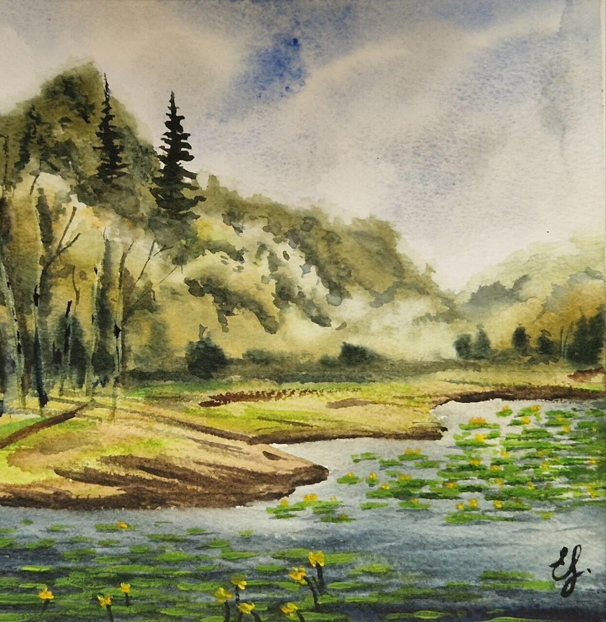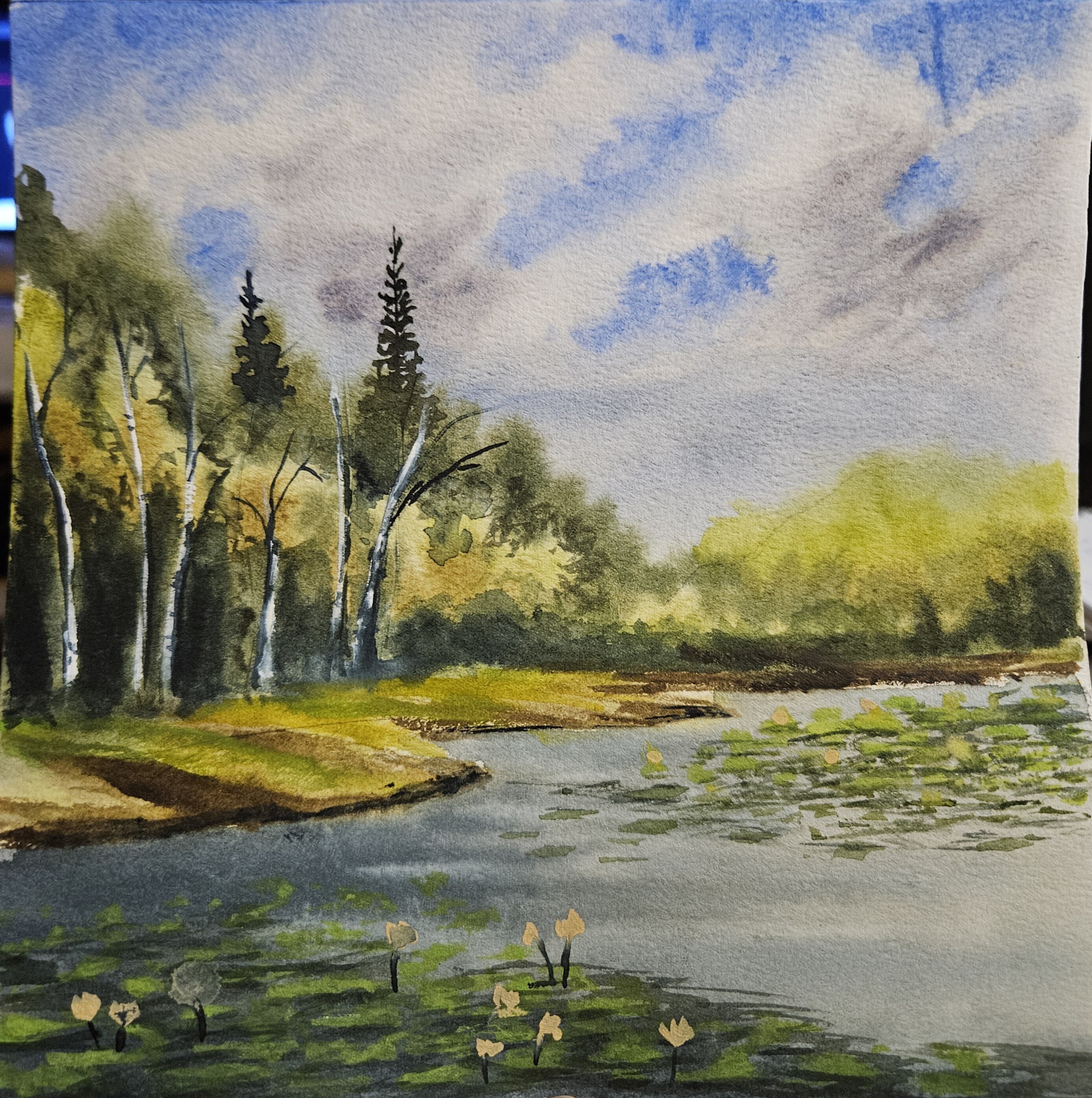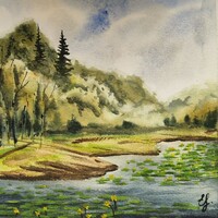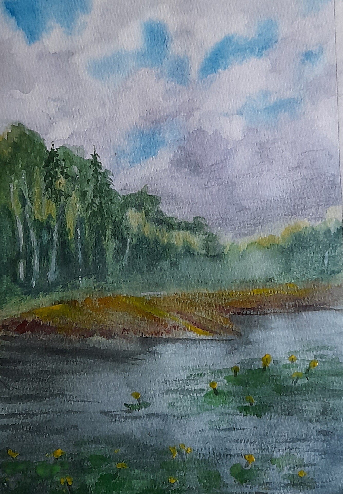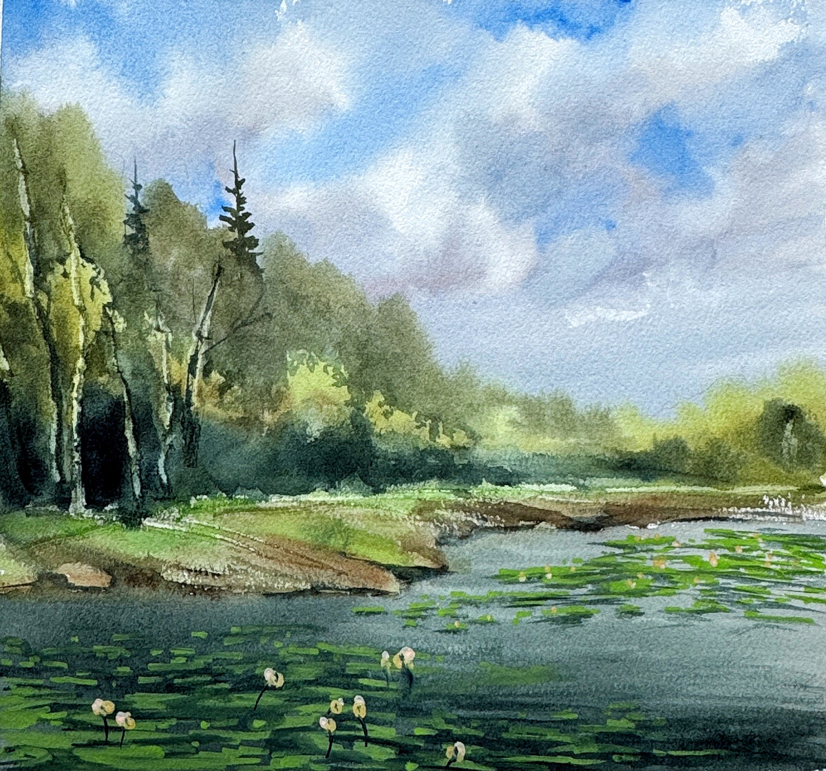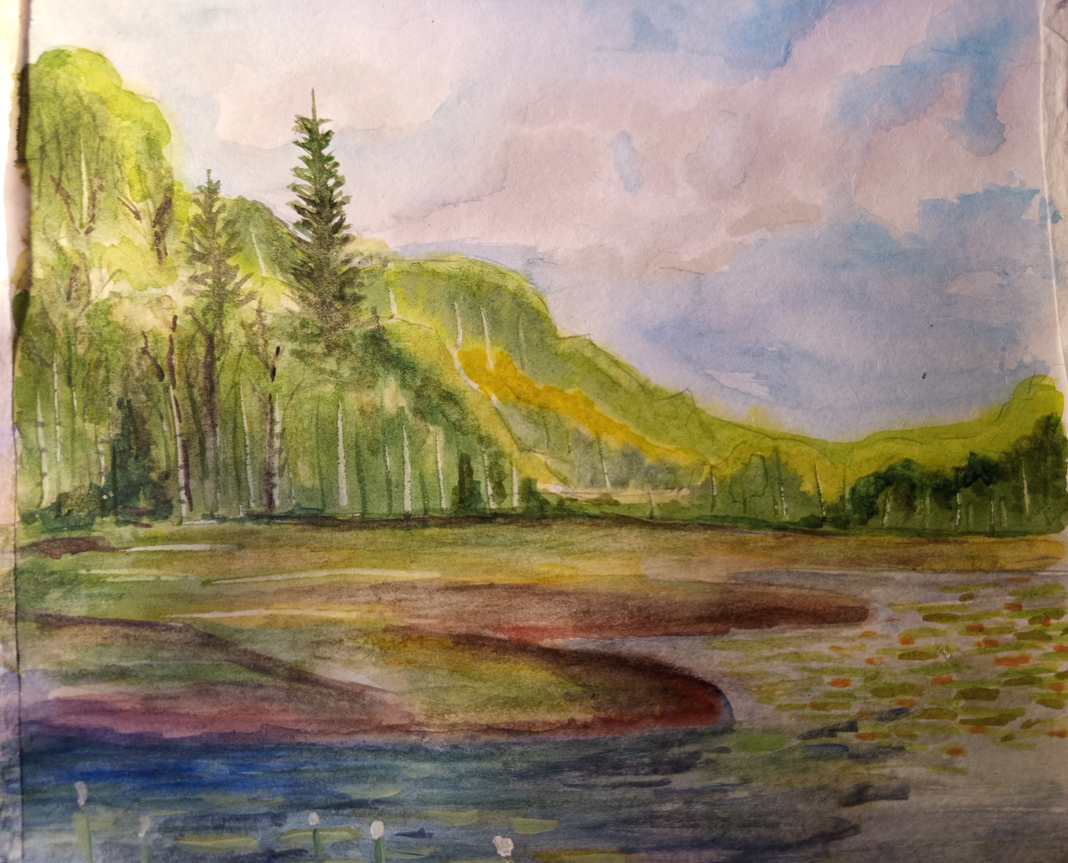 - поработаем с контрастами: яркая сочная зелень будет сочетаться с тёмной водой и небом;