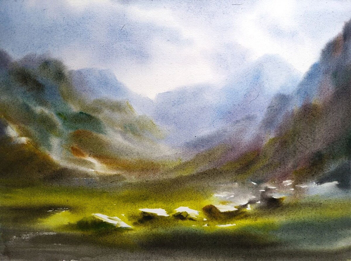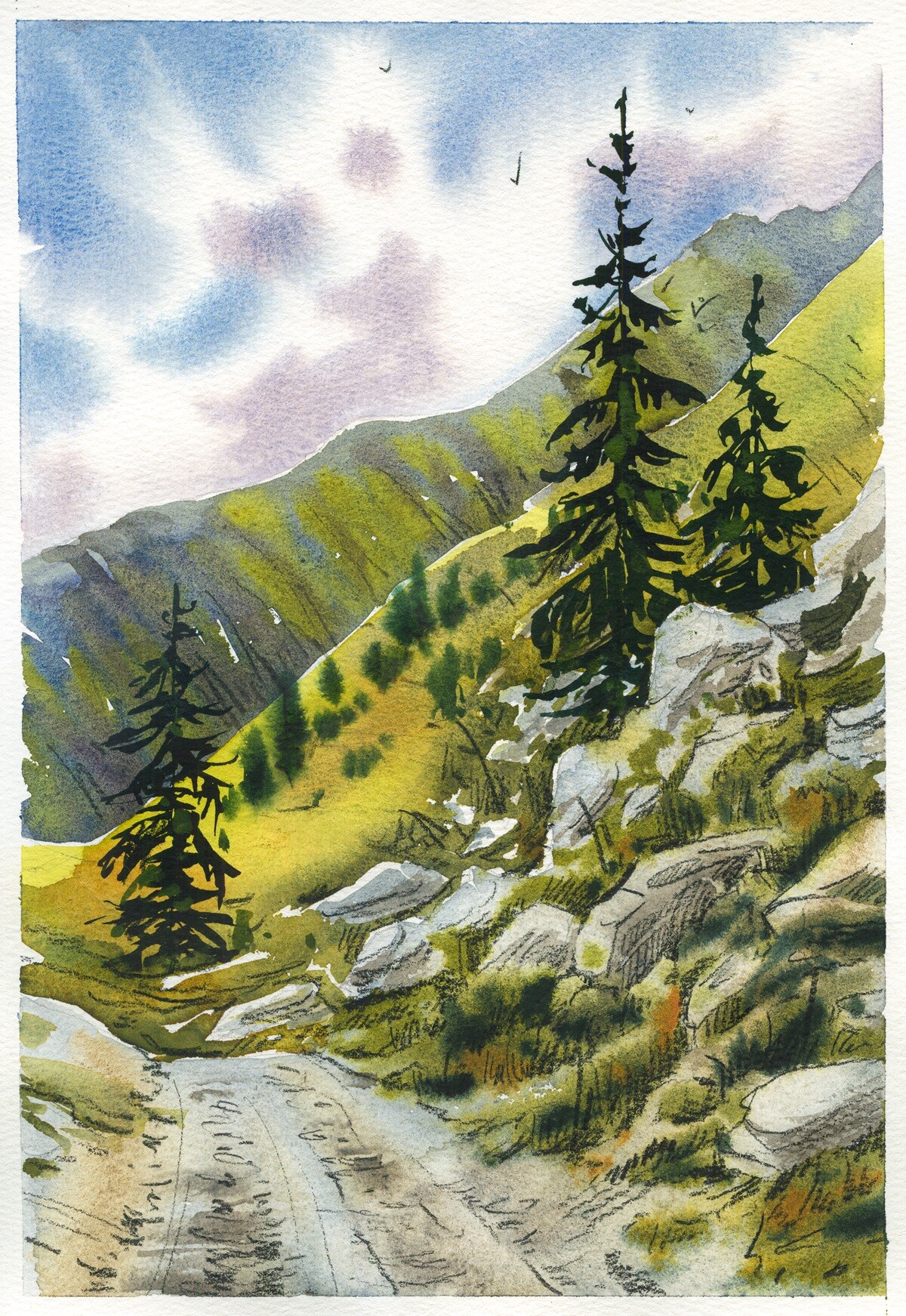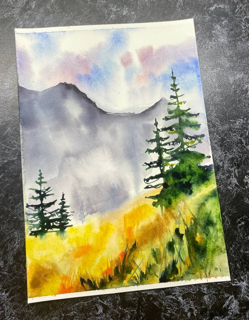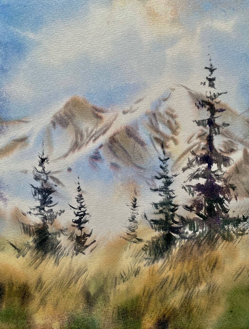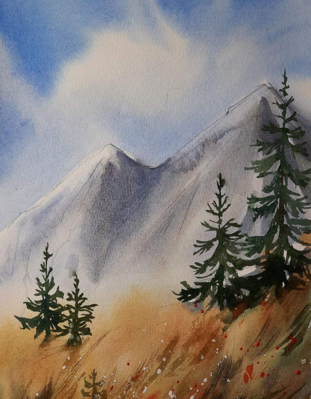 В эфире мы рисовали эффектный горный сюжет. А еще обсудили особенности комбинирования акварели с другими материалами.