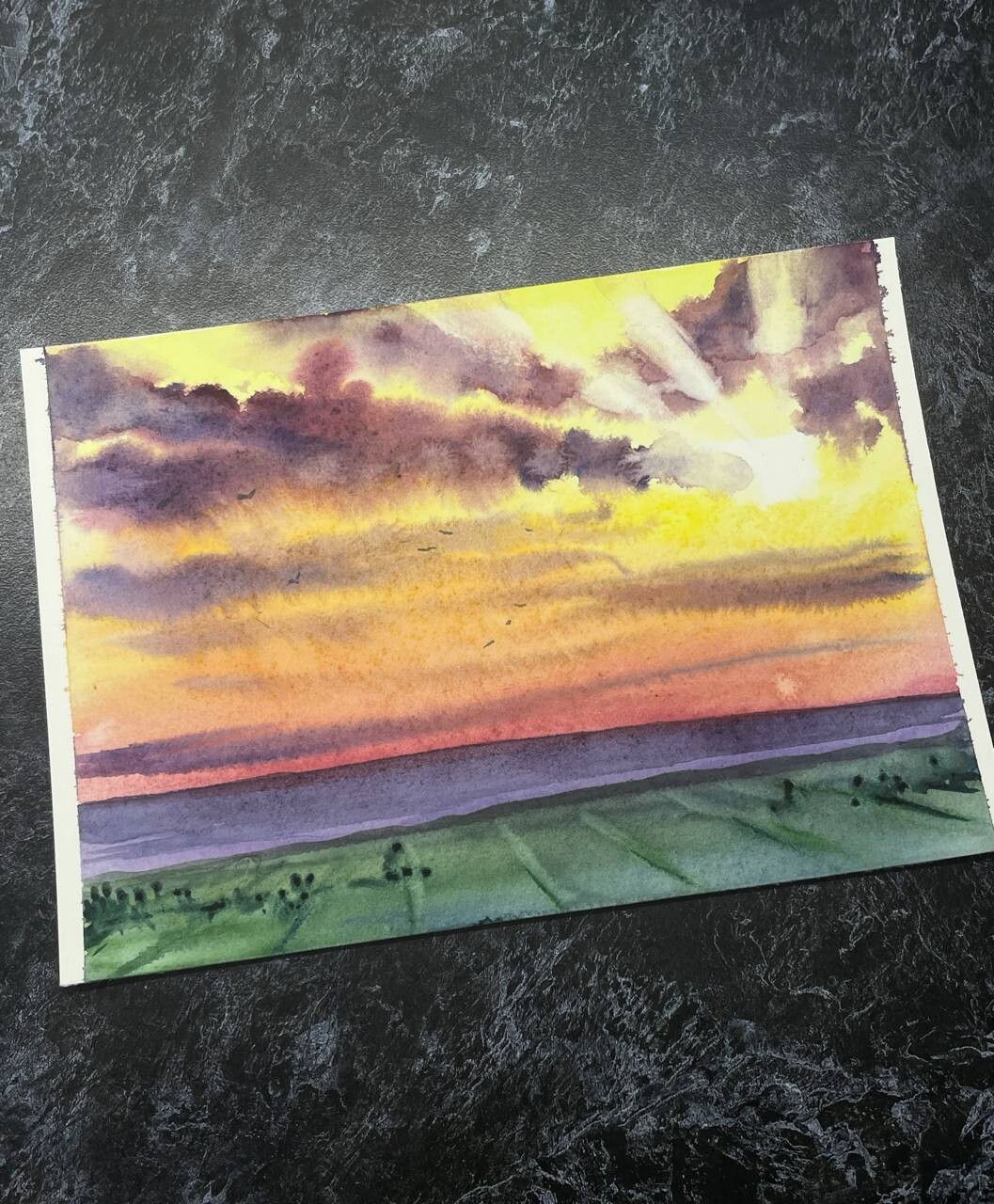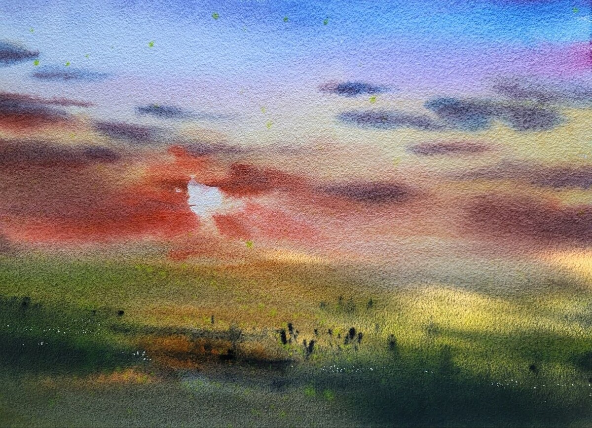 - напишем поле простыми пятнами — без лишних деталей, но с ощущением глубины;
