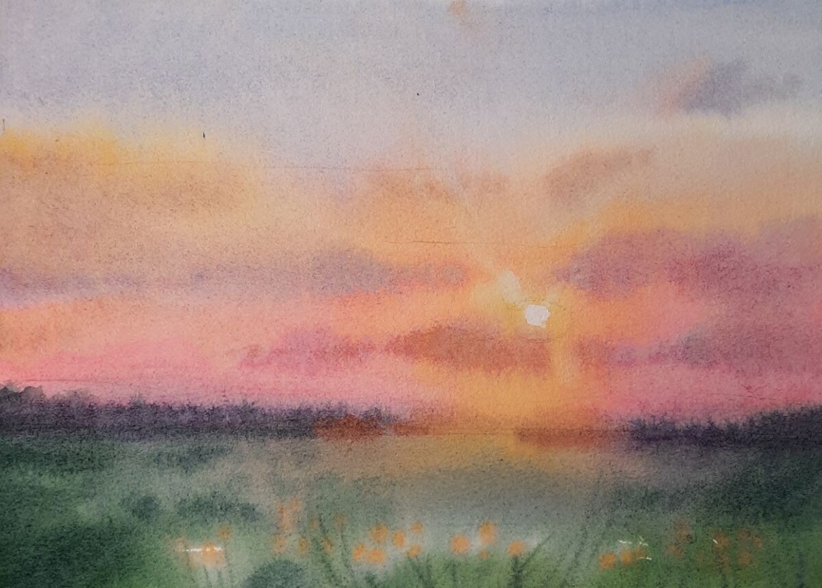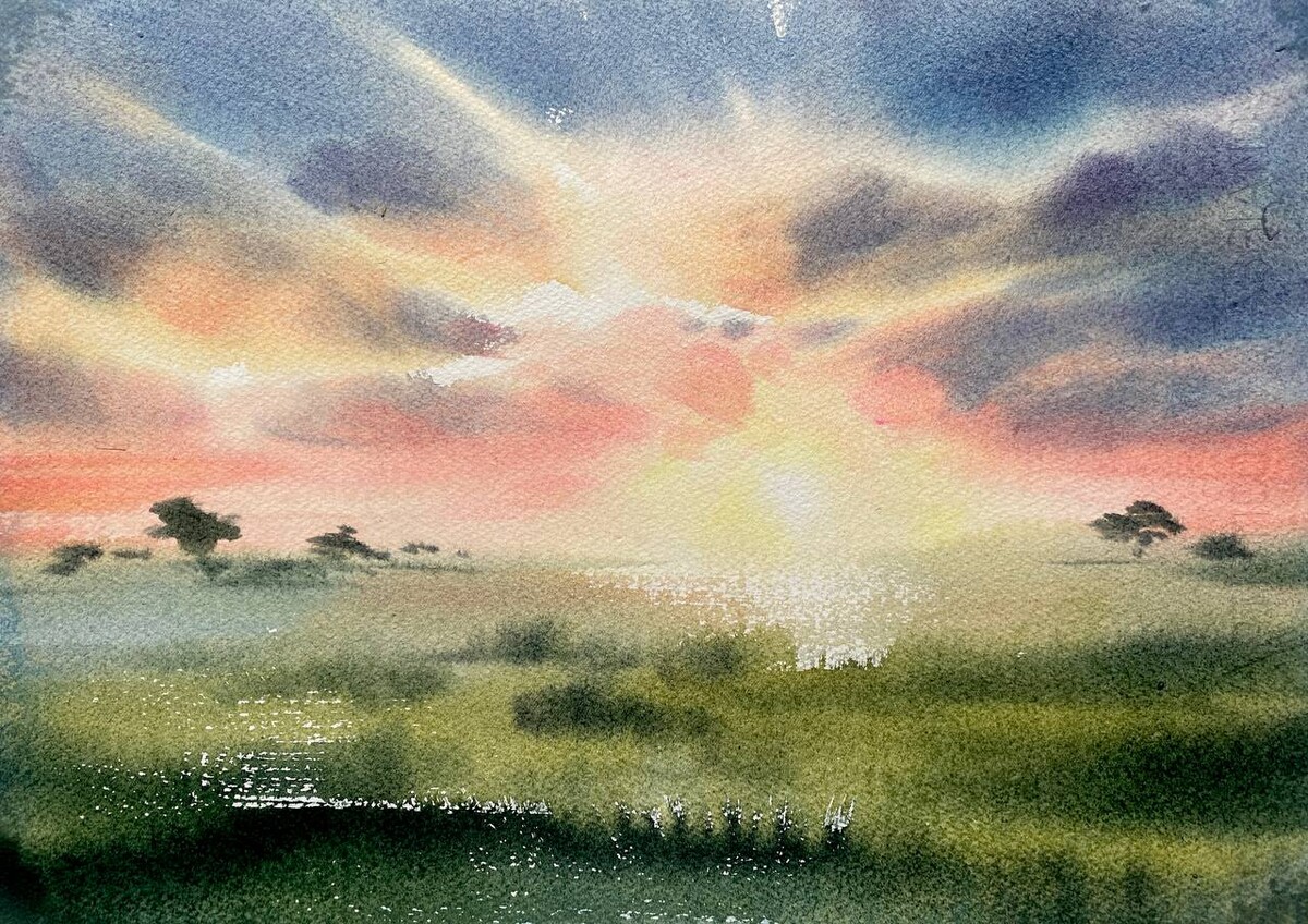 В первом эфире мы нарисовали наш первый небесный сюжет — с красочным закатом! А еще я рассказала, как прием обобщения усиливает пейзаж и делает его выразительнее.