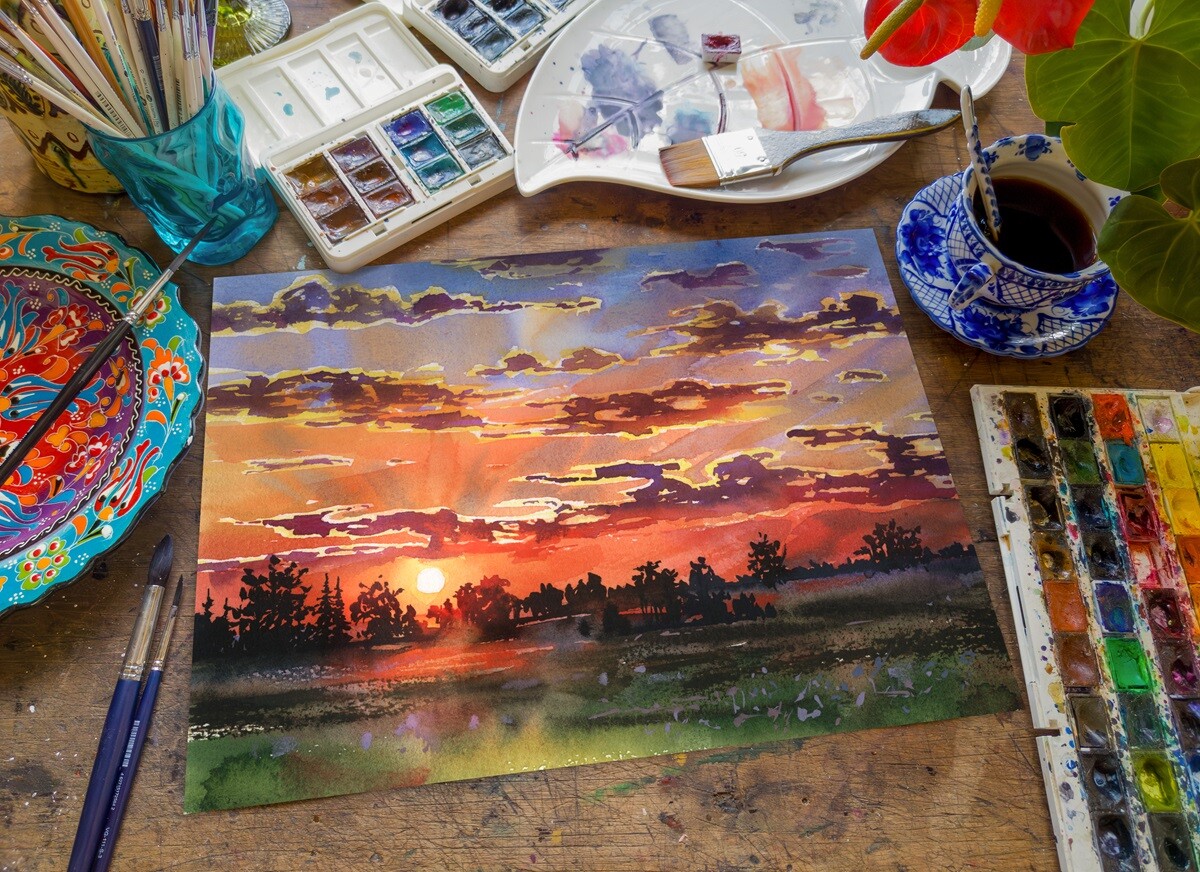 На этом уроке мы сосредоточимся на создании эмоционального, насыщенного по цвету и настроению неба. Поговорим о контрастах, работе от пятна и умении «ловить» состояние в моменте.